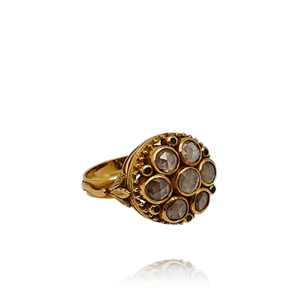 | OUTROS | 6 Esmeraldas Rdondas com aprox.: 1.0mm, 7 Diamantes Lapidação Rosa com aprox.: 5,0mm, Contrastes Dragão e Galo, Med.: 19 |